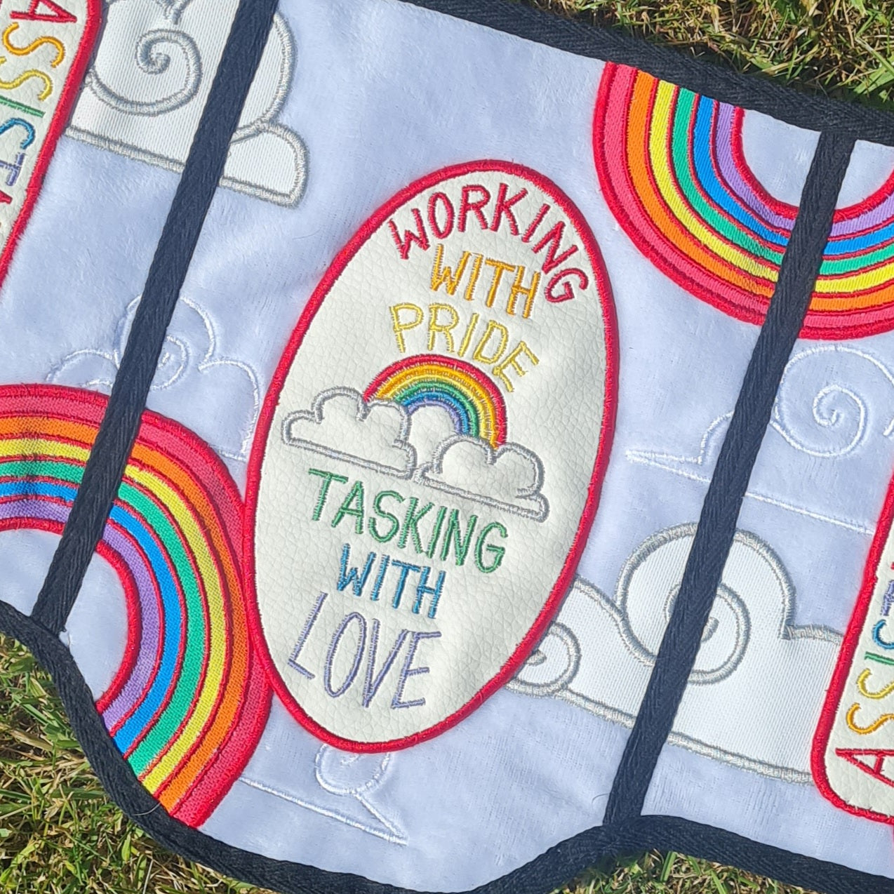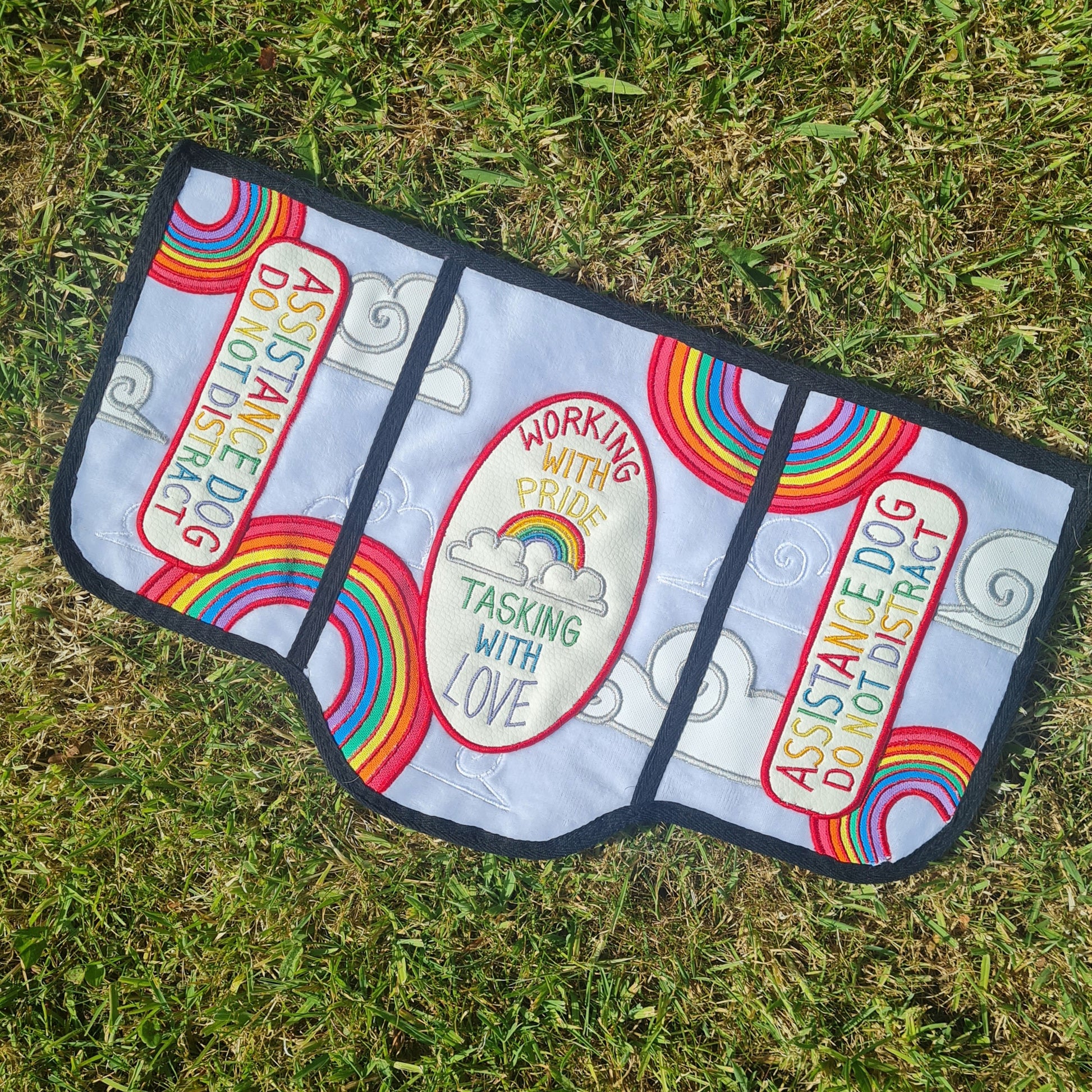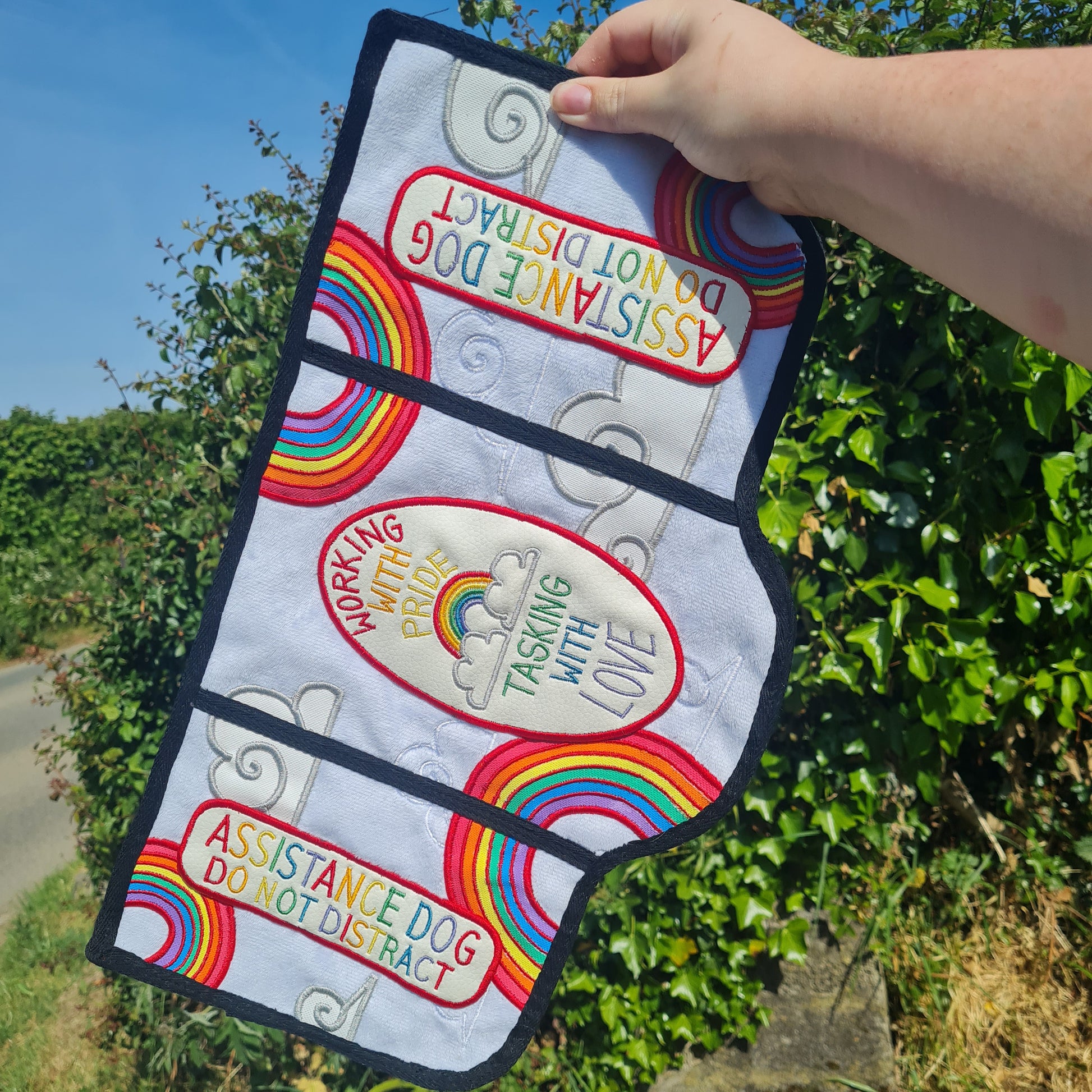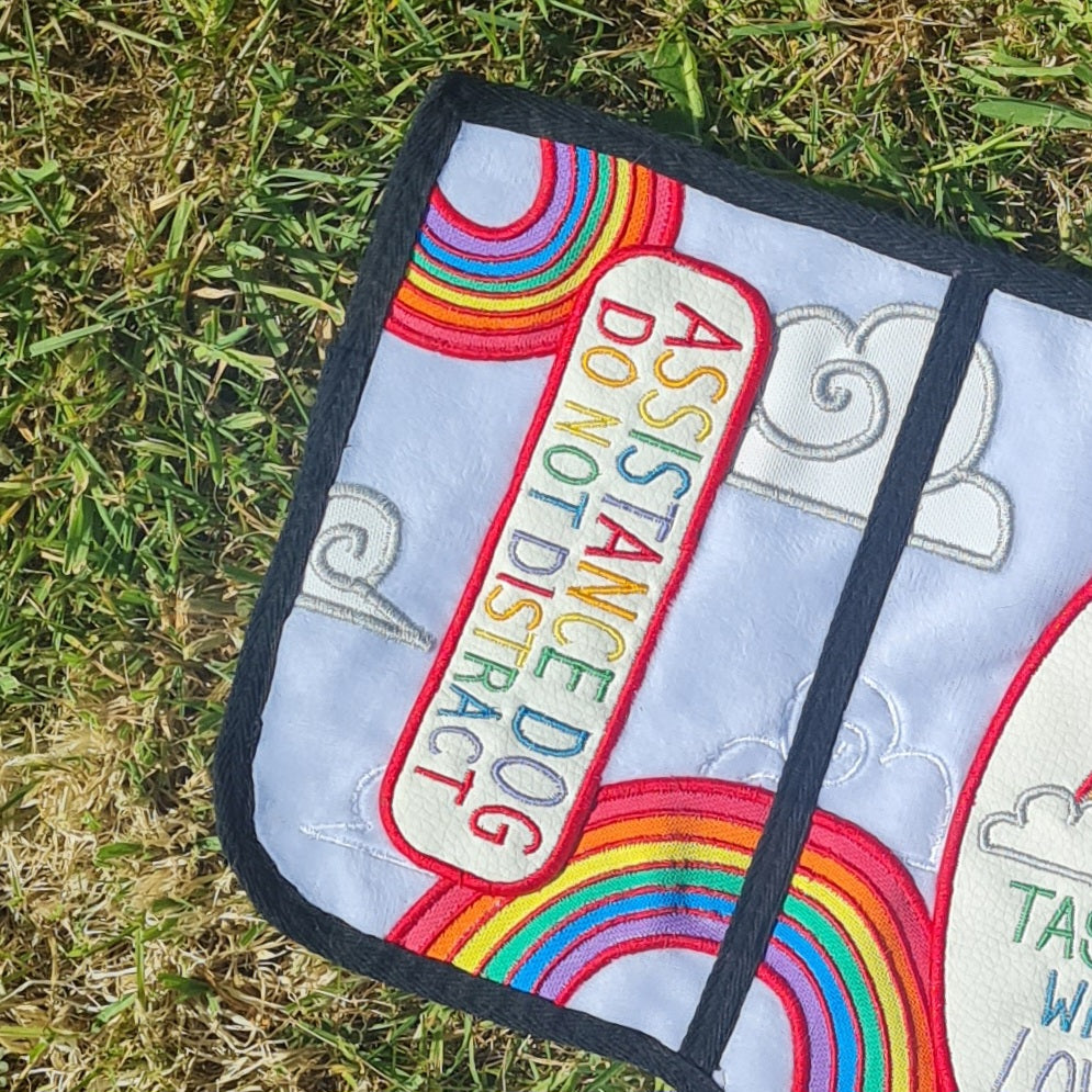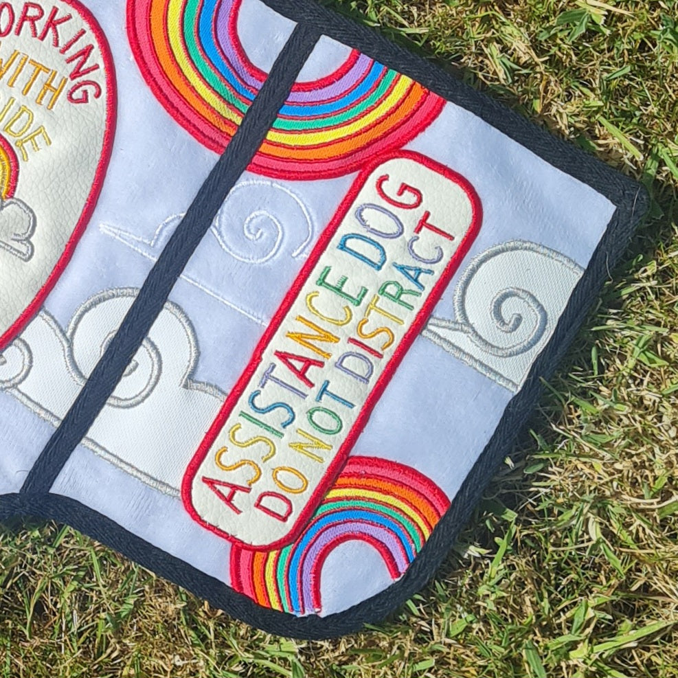 This vest features a cloud-soft white plush fabric base, decorated with arcing pastel rainbows and spiralling cloud appliques, all of which are personally designed, machine embroidered, and then hand sewn on; this premade beauty also features sewn on rainbow patches, both on the sides and back, for effective labelling that shows of your Pride both in the month itself, and year round!